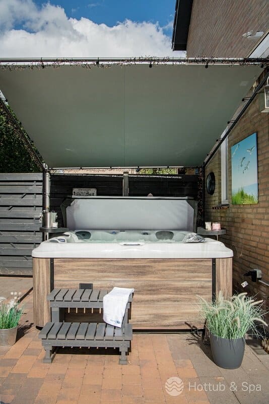 Wilt u een spa met een natuurlijk uiterlijk? Deze houtlook ombouw om buitenspa geeft een heerlijk natuurlijk effect. De ombouw is gemaakt van aluminium met een houtlook afwerking. Veel houtlook afwerkingen zijn absoluut niet mooi, maar MEGAspa is er wat ons betreft in geslaagd om best een mooie houtlook ombouw om deze buitenspa te maken welke behoorlijk in de buurt komt van echt hout!